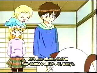 away, and warped out here by the distortion of time-space. Also they wished to stay there for a while because their navigation system was broken. Then the strange 'family' builds up and many things will happen around them. - (CALCI) The story is about a boy, Kanata, and a girl, Miyu, who are both in their early teens and have stumbled upon an alien baby, Ruu-kun and his "sitter", Wanya. Ruu-kun is a very young baby who still can't walk or talk, but he can do all sorts of ESP-type tricks and fly like Ten-chan in Urusei Yatsura. But unlike Ten, Ruu is good natured. His sitter, Wanya, is a large, sentient cat who can talk. |