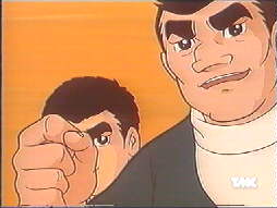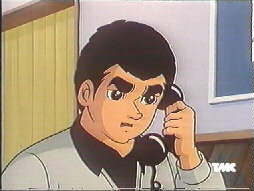 Review | This is a very old sports anime series, but still worth a look. Unlike almost all modern anime, but like "Attack no.1" from the same period, it is completely devoid of intentional humour. Instead, what we get is a straight and fairly mature drama about a sportsman and his personal problems. Tommy (in the episodes I've seen) tries to maintain a relationship with singer "Jenny" despite discoragement from his trainer and management, who fear distraction and adverse publicity, and the annoying attentions of the Press, who are eager to manufacture photo-oppurtunities and blow them up into a scandal (just like today's tabloids). I haven't seen him play a game yet! Instead, we get atmospheric glimpses of a Japan that is now some 30 years in the past. The character design is quite odd, with male characters looking rugged, and the women (including the singer-girlfriend, who presumably is pretty) looking quite ugly. This series has survived well. Your chances of seeing a fansub are zero (unless somebody reading this accepts the challenge) but try and see it if you can. Tommy & trainer |