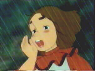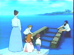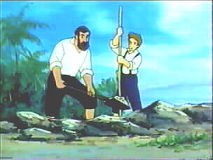 Review | I have only seen a few episodes in Dutch, a language I don't understand, and I had not read the book at the time of viewing, so I had to rely heavily on James S Taylor's review of the American dub edition in Protoculture Addicts #32. The character design for the small girl looks a little odd, but apart from that this looks like a solidly designed series, with lots of substantial and well-executed background detail, of ship, raft, encampment and the island itself. In the second episode there is a well-animated sequence where Robinson and his son build a raft. The little girl reacts just as a little girl might, wanting to go and play despite their plight. As for the story (and here I am relying on Taylor), it doesn't shy away from real disaster, pain and death. All the crew and some passengers have died (the captain is seen dead on the beach), and the elder son has lost his girlfriend. It is evident that an entire ship-load of farm animals has gone down, trapped in the hold of the ship. In one scene the elder son actually shoots a cute, furry animal in a dim light. Every episode advances our knowledge of the island and of the personalities of the characters. Seems like a series worth watching if you can get it in a language you understand. With caution, the novel can be used as a script guide. I borrowed "Swiss Family Robinson" from the public library. There was an androgynous-looking young person on the front cover, so when reading the first chapter was considerably surprised to find that the girl "Vroni" does not exist in the book, and that the family has four sons, instead of two sons and a daughter as in the anime. There are other minor differences: in the book the crew just escape, leaving the family to their fate, and at least some of the farm animals on board ship are rescued. The incidents of the captain saving the eldest son, who then finds him dead on the beach, are not in the book (not early on, anyway). So there has been a fair amount of tinkering for dramatic effect. Otherwise it seems basically the same story. Raft building | Digging |