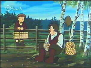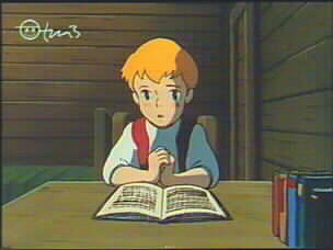 Review | Grandfather | Katri reading This is a low-key but well detailed story of a young girl, Katolie (Katri) living on remote farms in Finland, and later in town, during the First World War. Katri is an intelligent child, who has taught herself to read. The backgrounds are very nicely done, and though it's not always dramatic (in various episodes, she gets chased by boy bullies, a farm burns down, a wolf is seen, and a cow gores a bear) it's quite watchable, and bears repeated viewings. One of my favourite WMT anime. Learn the German for "cow" etc.