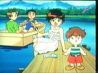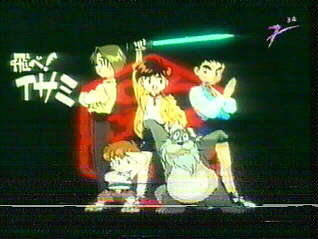 Review | Characters This is the mid-episode eye-catch from this series, which was dubbed into Arabic. Note the energy sword. It seems to be a comedy adventure, with four children, one much younger than the other three, as principal characters. The adventure seemed to be centred around an object with a carved end, which also appears in the end credits. See Hitoshi Doi's site for further information. |