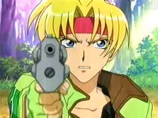Kurodo ( Claude in the game ) is on a giant Star Trek-like spaceship with his father when, while exploring a crashed alien spaceship, Kurodo looks into what appears to be a stone coffin and is transported to some pastoral world. Well, sort of pastoral, because the world is now being invaded by ugly aliens. On the mysterious world, a pointy-eared, blue-haired girl named Rena is remembering the legend of a blond-haired boy with a sword of light who will save the place. Then Rena goes off into the deep woods, where, sure enough, a giant ape-like monster pops out of a stream to menace her. ( The ape looked a lot like the giant ape in "Grappler Baki", so I expected Baki himself to pop out at any moment to pound the crap out of the ape. ) Kurodo hears Rena's screams, and following her overly cute pet bunny's trail, he first smashes the ape over the head with a branch, then blasts it to bits with a phasar that his father just so happened to give to him before he got transported away. Rena sees Kurodo's blond hair, and the big blast of light from his phasar, and decides that Kurodo must be the savior from legend. So starts what looks like will be a fairly pedestrian kid's fantasy adventure. There was no humor or irony in the episode and the animation and music were tolerable but not memorable. I suspect that this show will do fine with pre-teen boys, for whom the plot and characters may potentially be novel, but almost anyone else will be able to write the plot and dialog at least one scene ahead of the show. ( For example, Kurodo, of course, just had to muse, "Koko wa ?" when he woke up on the strange planet. ) BTW - am I the only person who wonders how the typical pointy-eared elf or alien girl sleeps at night without breaking all the cartilage in those stiff ears? (Dave Baranyi) |