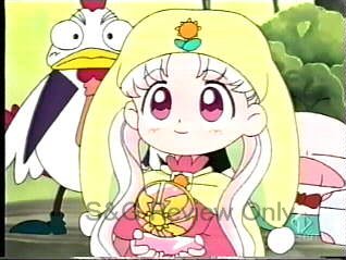 Review | Many of the minor characters are not human at all, but anthropomorphised vegetables, ducks, frogs etc, and the setting owes a lot to traditional European tales for children. In short there is very little that's Japanese in the setting. However the tale is told with acerbic humour and the human character designs are typical "cute anime", complete with the familiar shorthand for anger and other emotions. This series is clearly aimed at younger children but parents and older brothers and sisters who are roped into watching should enjoy it too. The lack of predictability shown in the script so far is a strong point. |