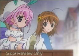 "Sugar" is almost too cute to describe, but it is also quite imaginative and different. ( It's also not ecchi. ) Saga gives Sugar a waffle and Sugar becomes inseparable from Saga from then on. This causes Saga all sorts of problems - it's hard for Saga to concentrate on anything with a loud mouthed fairy yammering on at high speed in her face. Some cute "adventures" occur and a couple of Sugar's friends show up to join her in her quest. All-in-all, the pace is very lively and bright and "Sugar" was a lot more fun to watch than I expected. "Sugar" does remind me a lot of "Risky/Safety", but no one is as "down" in "Sugar" as in "R/S". (Dave Baranyi) I liked this - it's really cute. (GC) |