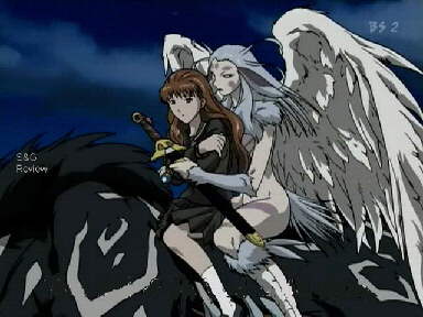 Yoko is a high school girl who is having really, really bad nightmares about monsters, death and blood. Her parents are trying to get her to color her hair black although it is naturally red, because they are ashamed of it, and she is becoming very alienated from her classmates and friends. Her nightmares get worse and she appears to be starting to hallucinate - one evening she sees what appears to be a beautiful blond girl by the water's edge. As she watched the girl turns into a brunet who appears to be a teen boy now with a threatening appearance who says to Yoko, "You smell like blood", then disappears. Then after she has to stay in class after school because of falling asleep in class, ( her teacher accuses her of "playing around" at night ) her dreams start to take a life of their own. Yoko feels a chilling breeze pop up behind her and turns to see a tall, strange looking man with long blond hair who is wearing an ancient style gown. The man comes up to her and tells her that she must leave with him right away. Yoko is terrified and struggles against the man while her classmates run for help. Yoko tries to run away but the strange man traps her, then knees in front of her, as if she were his master. At that point her teacher runs in and starts to yell at both the stranger and at Yoko, as if everything were her fault. Then the room starts to rumble and a blast hits - everyone in the room but Yoko and the strange man are injured by debris and flying glass. Yoko runs out and is eventually convinced to go to the roof top of the school where she sees that a giant, roc-like bird is flying at the school, causing terrible damage at each pass. Then the stranger starts to call out various giant animals and strange beings to fight the roc and to give Yoko a sword. Two of Yoko's classmates are also trapped on the roof and one of them, a girl who spends her time reading ancient fantasy novels, is excited about the entire situation and even asks the name of the stranger, who calls himself Keiki. Keiki wants Yoko to use the sword to fight the roc, but Yoko refuses, so Keiki calls up more strange beings who take the three kids through the air to a pier on the ocean far away. Yoko continues to refuse to co-operate, even when the roc appears again in the distance, coming towards them. So Keiki summons up a water spirit who immobilizes Yoko, enters her and takes over her in time to have her behead the bird with the sword as the roc attacks again. Keiki then has two more spirits, a giant wolf-like creature and the female looking spirit who gave the sword to Yoko, take Yoko off to travel through a warp in a storm to the 12 Countries. Like I said at the beginning - wow, what a ride! This is really top-of-the-line fantasy. No effort was spared in the first episode and Yoko is definitely not your usual girl's adventure protagonist - she is more like a character from "Lain" or "Boogiepop Phantom". Add to this the really top notch animation and a score that would be suitable for a movie and this looks to be one of the highlights of this year, along with "Abenobashi". Tell the fansubbers to clear some disk space - this is going to be a big one! (Dave Baranyi) "12 Kokuni" - I've seen four episodes now and this adventure show is definitely fulfilling its promise. Yoko is finally starting to realize that the only thing that separates her from death or torment is how quickly she can pull that sword and use it. And the complicated background details of the situation are only barely starting to open up. NHK has a real winner here and should for quite a while. (Dave Baranyi)