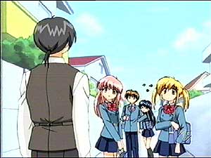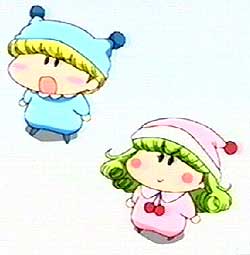 Review | image fairies| There are always new "cookie cutter" kid's anime being created. Shounen anime often have grade school boys who prefer to play games than study, who find super science toys that force them to learn to overcome challenges. Shoujo series often have shy middle school girls who really like a popular boy, then find a magical means to develop self confidence and get the boy. What differentiates the better shows amongst the crowd of ordinary shows is what variations are added to the characters and twists to the plots. The new TV Tokyo Saturday morning shoujo series "Wagamama Fairy Miremote Pon" is very typical of what I mentioned above. Kaede is entering the second year of middle school and really likes Yuuki, but from afar, and she is hoping to get into the same class as Yuuki. So far, this is much the same set up as many other shoujo series. But now comes the "differentiator" - Miremo. Miremo is a fairy in the Fairy Kingdom. Now, these fairies aren't like your typical Disney fairy, e.g., a slim, slight sprite like Tinkerbell. Instead Miremo is a tiny munchkin who looks like a cross between Ruu from "Daa Daa Daa" and the Pillsbury Dough Boy. In fact, all of the fairies of the Fairy Kingdom look pretty much like that. Miremo also has a real attitude, thus the attribution of being "wagamama" (selfish). Miremo's two big interests in life are taking it easy and eating chocolate. Miremo has a problem, however, because Riremu, the little green haired munchkin daughter of the King of Fairies likes Miremo. But Miremo considers Riremu bad news and tries to stay away from her as much as possible. (Miremo accuses Riremu of casting spells that don't work.) The King of Fairies calls Miremo in to tell him that he is assigned to go to the Human World and work magic for humans. Miremo will have nothing to do with this because there is nothing in it for him. But the King then offers the alternative - if Miremo stays he has to marry Riremu. Miremo takes off in a flash to escape both fates. In order to hide, Miremo goes down a dark stairway under a tree to a large room full of decorative ceramic mugs. While Miremo is trying to figure out what is going on, a blast of magic light emits from one of the mugs and drags Miremo into it. ( Miremo is small enough to fit easily into a coffee mug. ) In the meanwhile, Kaede spots Yuuki in a music store, but is too shy to go in and say hi. At that moment, a strange shop appears across the street and attracts Kaede's attention. Kaede is drawn in and sees that the shop is full of mugs and other ceramic knickknacks. There is also a very bizarre, almost frog-like sales clerk who looks at Kaede with knowing eyes. The mugs are supposed to be "wishing mugs", so Kaede makes a wish that she and Yuuki will end up in the same class, then leaves the shop. The next day Kaede is ecstatically surprised to find that Yuuki is in her new class. However, a new girl to the school is introduced, a beautiful and quite forward girl named Hitaka. Hitaka immediately puts a move on Yuuki before Kaede can even say a word. Later on, as Kaede goes home in despair, the strange mug shop reappears. This time Kaede buys the mug and brings it home with her to try the wish magic out. Kaede pours some hot water into the mug, and suddenly a bright light appears and Miremo pops out, none-too-pleased to be in the human world. Kaede is astonished and doesn't believe her eyes. She grabs Miremo and runs out to show "the little monster" to her Mom, but her mother can't see Miremo. Needless to say, Miremo is even more pissed off at being called a monster. He tells Kaede that it was his magic that caused her and Yuuki to be in the same class. But Miremo isn't interested in doing any more magic for Kaede. Kaede tries various ways to bribe Miremo, without any success. Eventually they get into a big argument and Miremo tells her that he won't and can't use magic to get Yuuki to love her, she has to do that herself. Now it's Kaede's turn to get really mad. The next morning Miremo wakes up to find Kaede off to school, and a dish of chocolate and an apology note left next to the mug. On the way to school Kaede decides to take Miremo's instructions to heart and tries to overcome her shyness and approach Yuuki, who has been grabbed already by Hitaka. Hitaka isn't about to take this standing still, and the girls start to argue over Yuuki while they drag him down the street. Yuuki finally trips, falls, gets up angry with both girls, and goes off to school by himself. When Kaede gets to class it is time for the student to draw for seats. Kaede, of course wants to sit by Yuuki. To her surprise and joy, Kaede does get the seat at Yuuki's left, which doesn't please Yuuki much. Then Hitaka gets the seat to Yuuki's right, which makes Yuuki really miserable as the two girls glare daggers at each other. Kaede then notices Miremo on the window ledge. She realizes that Miremo's magic got her the seat beside Yuuki and thanks Miremo. Kaede asks Miremo why did he stay and do another magic spell, and Miremo shrugs it off as repayment for the chocolate, but Kaede suspects it is something more. The episode ends with a silhouette that looks a lot like Riremu standing on a nearby tree branch outside the classroom. The silhouette says "Now I've found you." So this new series has a fairly high "cute factor", and I'll follow it for a while, but I'm not sure how much long term appeal it will have. (Dave Baranyi)