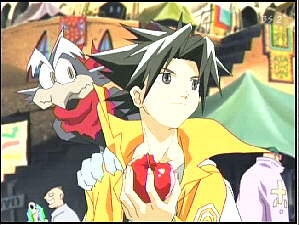 Jing is a mystery character, very cool and confident and quite young - he looks to be in his mid-teens. Most other characters disregard him as "just a kid". Jing also has a talking "parrot" of sorts named Kiru, who is a hentai wiseacre who just happens to transform into a very powerful weapon for Jing as required. ( Kiru reminds me a lot of Joe Carioca from "The Three Cabelleros". ) But Jing is also very adept with slight-of-hand, has blindingly fast moves and a has very powerful sword up his sleeve. The first episode was set in a very baroque "Tower of Babel" sort of thieves' palace in the middle of a wasteland set in what appears to be a "world of thieves", equivalent to the "world of pirates" in One Piece. As with Trigun and One Piece, there appears to be a mix of technological levels in this world ( as indicated by a character who rides up on a motorcycle ) but there is also powerful magic. And unlike Lupin, Jing does not seem to be stealing only for the sake of stealing - this gives a vague feeling of similarity to "Eat Man" in the show, but with more humor. The background music for the show is mainly jazz and blues - not the typical j-pop or attempted "cool" music typical in most TV Tokyo shounen action shows. The animation is also anything but "typical" - not only is there a lot of detail in the backgrounds and character designs, but there is also a lot of very well done and extremely well integrated 3DCG in various scenes. All-in-all, "King of Bandits Jing" looks to be another winner for NHK and I will be looking forward to seeing more episodes. (Dave Baranyi) Saw the first episode - it's well - produced and entertaining. The young hero Jing however seems to have all the cards stacked in his favour. He's good-looking, in contrast to the other characters who are generally rather ugly, he's smart, and he has a powerful companion/weapon in the lecherous parrot. There's no clue to how things may develop in further episodes. (GC) |
