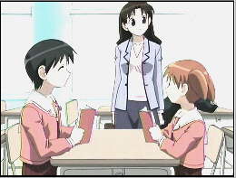 From the moment the big-eyed schoolgirls bounce across the screen in the opening credits to a catchy opening theme, one has the feeling that this is going to be a lot of fun, and it is! The character designs look slightly old-fashioned, doubtless deliberately so, for there is only innocent fun here - no violence, angst-ridden Adult Relationships or jokes so risque one daren't repeat them in sight of the Moral Majority - just brilliantly observed comedy and a collection of amusingly depicted characters. |