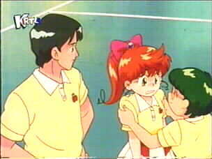 names include: Karin, Kouichi, Keiko. Anyway, the character designs are very pretty and colourful and the episode I saw, about a tennis challenge match, was definitely fun. Another episode I saw later wasn't so good. This series has been sold to several countries, but I'd rate it well below Hime-Chan's Ribbon or Blue-Green Years. However it's easy to believe that these characters are like real people. Images: Karin & pig | Karin on court Much more information is available in the Tonde Buurin section of Hitoshi Doi's vast website. |