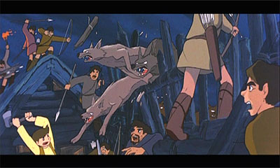 been released by Optimum Asia. I was expecting some rather outdated "classic" and was pleasantly surprised that this movie exceeded my expectations. The dramatic opening sequence, in which the boy Hols fights off a pack of wolves and, losing his axe, makes a final stand atop a rock which turns out to be a slumbering Rock Giant, sets the marker for what is to follow. The movie has impressive animation, well realised characters and settings, powerful and touching themes, and some fine music. Particularly pleasing is that the village seems to have a life of its own, including fish-drying and a wedding, and is not just a backdrop for the main action. Overall the movie seems surprisingly modern, and in fact I'd rate it above one or two of the more recent Studio Ghibli output. |