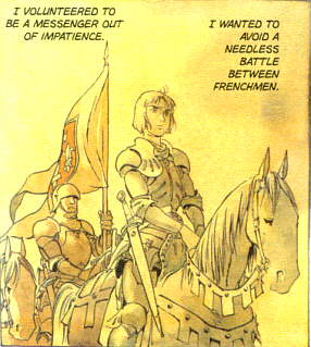 In the third volume, Emil, accompanying the King's army, is given Joan's flag. The Dauphin tries to set the place of battle by siezing the King's mistress,