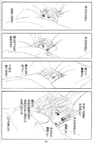 Notes | #2, p.80: Dialogue, from top left. Girl :What's the purpose of my life? What's the purpose of getting up in the morning? Change one's clothes, wash one's face, eat breakfast? School is 20 minutes walk. Everybody walks. A suitable time to decide what to do with my life. When but now. ... . (Tr. by G.C.) |