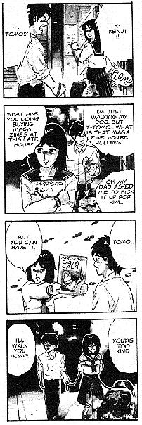 This is a short section of 4-panel gags, most of which are rather rude. Sometimes the joke is rather obvious, but with other strips one has to read carefully and think about it a bit. Each 4- panel is complete in itself, but the characters, like the teenagers 'Tomoko' and 'Kenji' sometimes make repeat appearances. Here is a typical example. (The vending machine sells S&M magazines. This is not unusual in Japan.) |