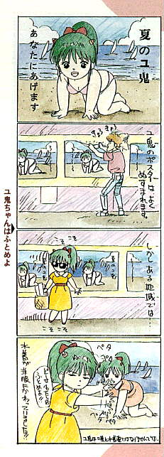 Notes | Komatta Yuki-Chan, p.9. Dialogue (from top left) -Harrassed Yuki-Chan; Yuki-chan getting fat- Note that she has tiny horns, just like Lum. The "ki" syllable of her name is written with the character for "oni" or devil. 1: Yuki's Summer 2: Yuki's poster gets stolen. 3: But strange obsession?? 4: "Anyway I'm getting fat!" Swimsuit is changed for dress. Yuki never wore a swimsuit again. Tr. by GC &YH Get original scan (higher resolution, 114K) MIX NOISE Animate Collection 13 |