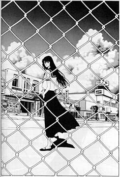 Let's dispose first of the idea that there is anything titillating in the 2-volume SEX series; there isn't, and the title seems to be essentially an attention-grabber. This large-format series, printed on high-quality paper, chronicles the interactions of tall slim schoolgirl Kaho and various punks. A complete revelation after the throwaway read-on the-train manga, this is so vivid and detailed that one can look through it for hours with renewed pleasure. Kamijo draws remarkably detailed and vivid street scenes, and attractive character portraits. Though entirely modern, the lines of the clothes of his characters often carry an echo of the long flowing garments depicted in tradional Japanese prints. Many of the frames are full page size, with little or no dialogue, and there are double-page mood pieces (V1,28-28,48-49,188-189). A few pages have a single spot colour (red in V1, blue in V2) used for heightened effect.